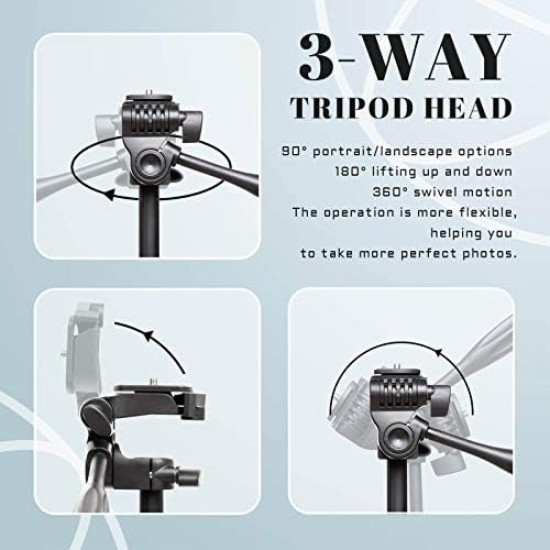 3-WAY PAN TRIPOD HEAD & QUICK-RELEASE PLATE & BUBBLE LEVEL – Multifunctional tripod head can realize 90 Degree portrait or landscape options, 180 Degree lifting up and down tilted and 360 Degree horizontal swivel motion, helps you adjust easily to find the perfect shooting angle. With quick-release plate, release and install devices become much more efficient and easier. Built-in bubble level helps you indicate whether a surface is horizontal (level) or not.