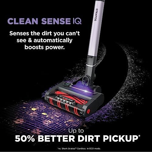 CLEAN SENSE IQ: Infrared sensor detects the dirt you can’t see and automatically increases power, giving you up to 50% better* dirt pickup. The Clean Sense IQ indicator visually shows when floors are clean. (vs. Shark Stratos Cordless in ECO Mode.)