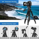 【 3-Way Pan Head 360° Rotation】 JOILCAN compact camera tripod is equipped with a stable smooth ergonomic 3-way pan head: headlock, pan lock, and tilt lock, which can satisfy all the needs of vertical, horizontal, and overhead photography, etc. You can freely adjustable angles for 360° panoramic shooting, 180°up and down shooting, and 90°vertical portrait. When you employ pans and tilts during photo or video recording, the tripod offers superb stability and gives you excellent, smooth results.